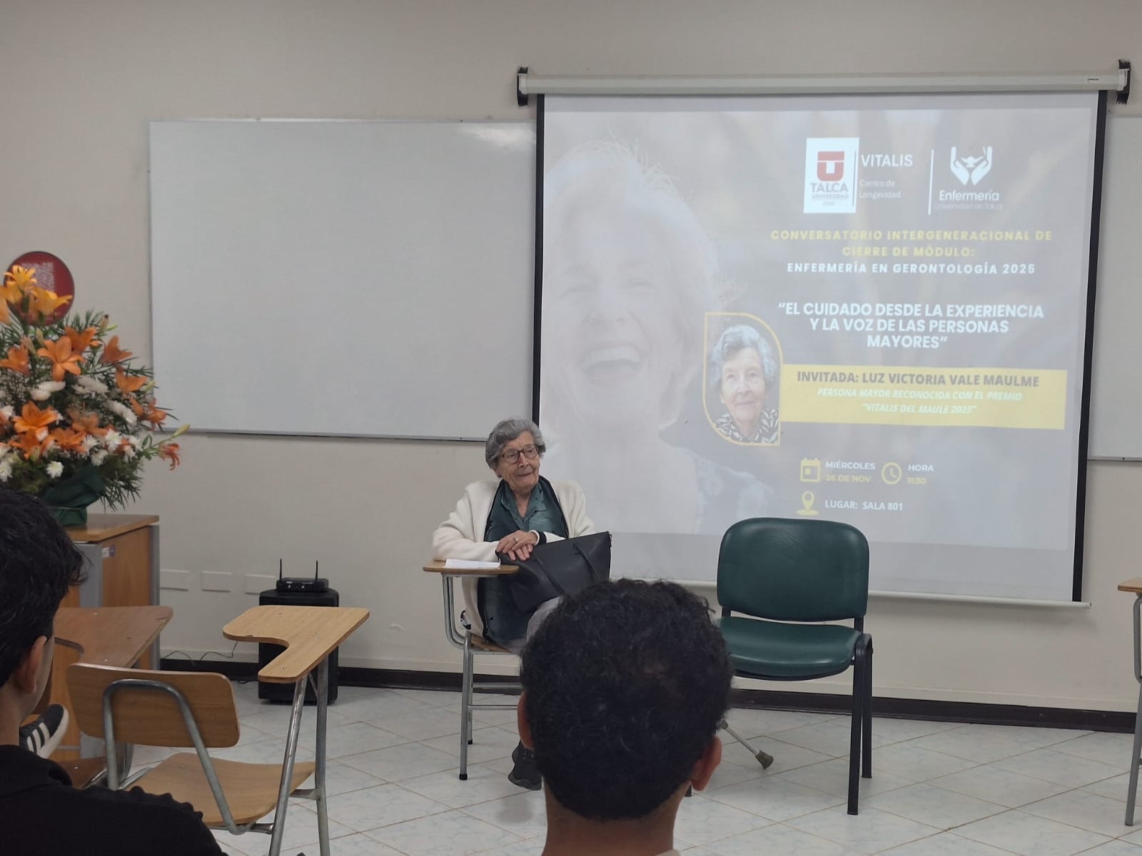 Como cierre del módulo Enfermería en Gerontología, estudiantes de cuarto año de la carrera de Enfermería participaron en un valioso Conversatorio Intergeneracional, organizado por la Escuela de Enfermería en colaboración con el Centro de Longevidad VITALIS de la Universidad de Talca.