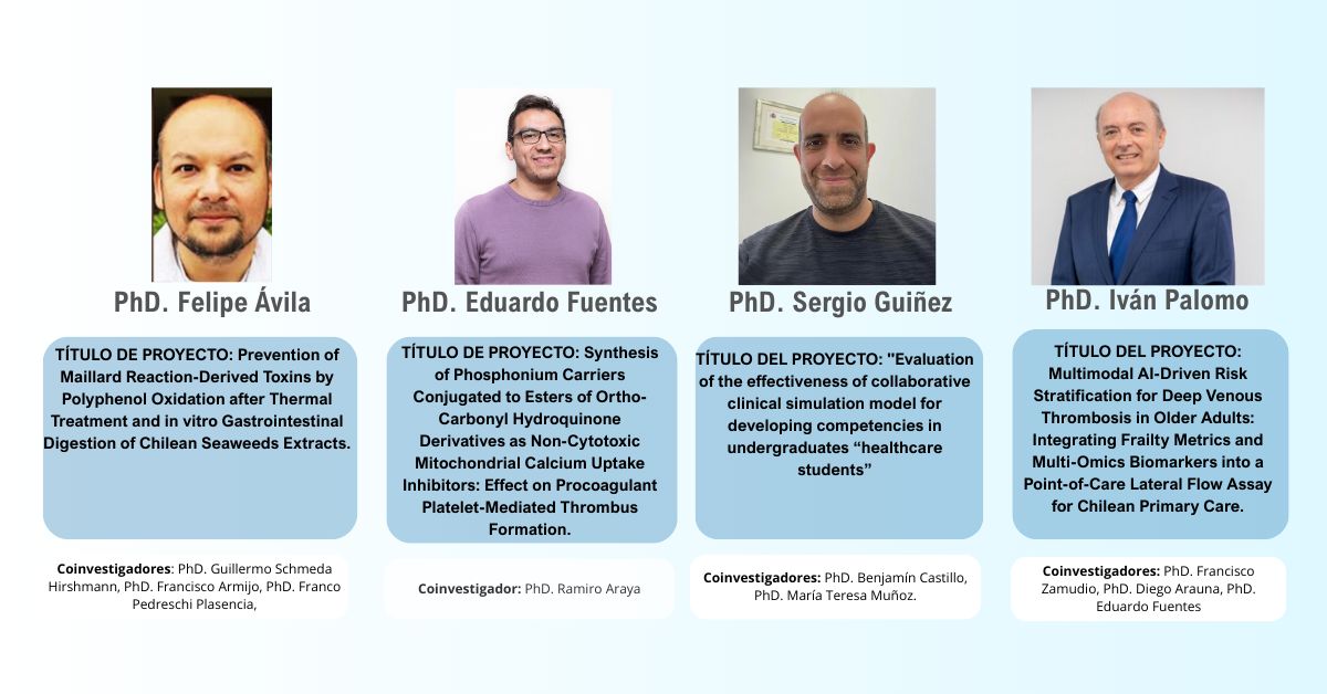Eduardo Javier Fuentes (Coinvestigador), Iván Francisco Palomo (Principal), coinvestigador, “Studies on the mechanisms of endothelial dysfunction and platelet activation in frail older people: Role of RhoA/Rho-Kinase pathway activation”. (2021, 2024).